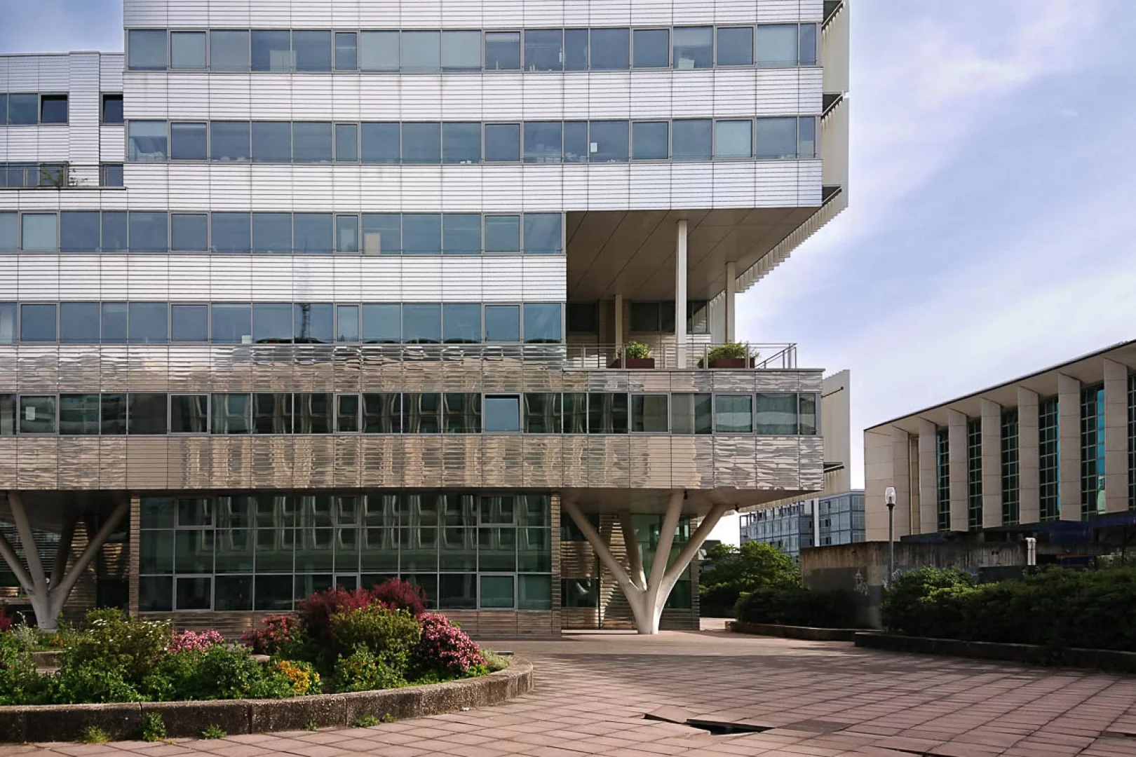 Les grandes marches qui sont du coté du cours Maréchal Juin, le batiment de la préfécture de la gironde qui est tout vitré, tout près de ce batiment il y a de jolis petits jardins/décorations florales.